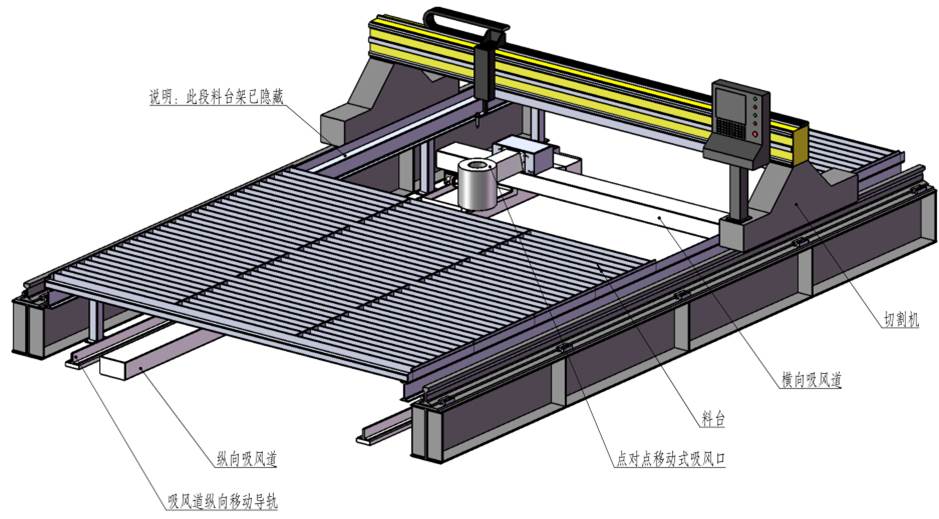 側吸式煙塵凈化系統采用吸風口固定在切割機龍門架上,吸風口與吸風道之間通過密封皮帶密封,吸風口可隨龍門架在吸風道上來回移動吸風,將切割的粉塵吸除。